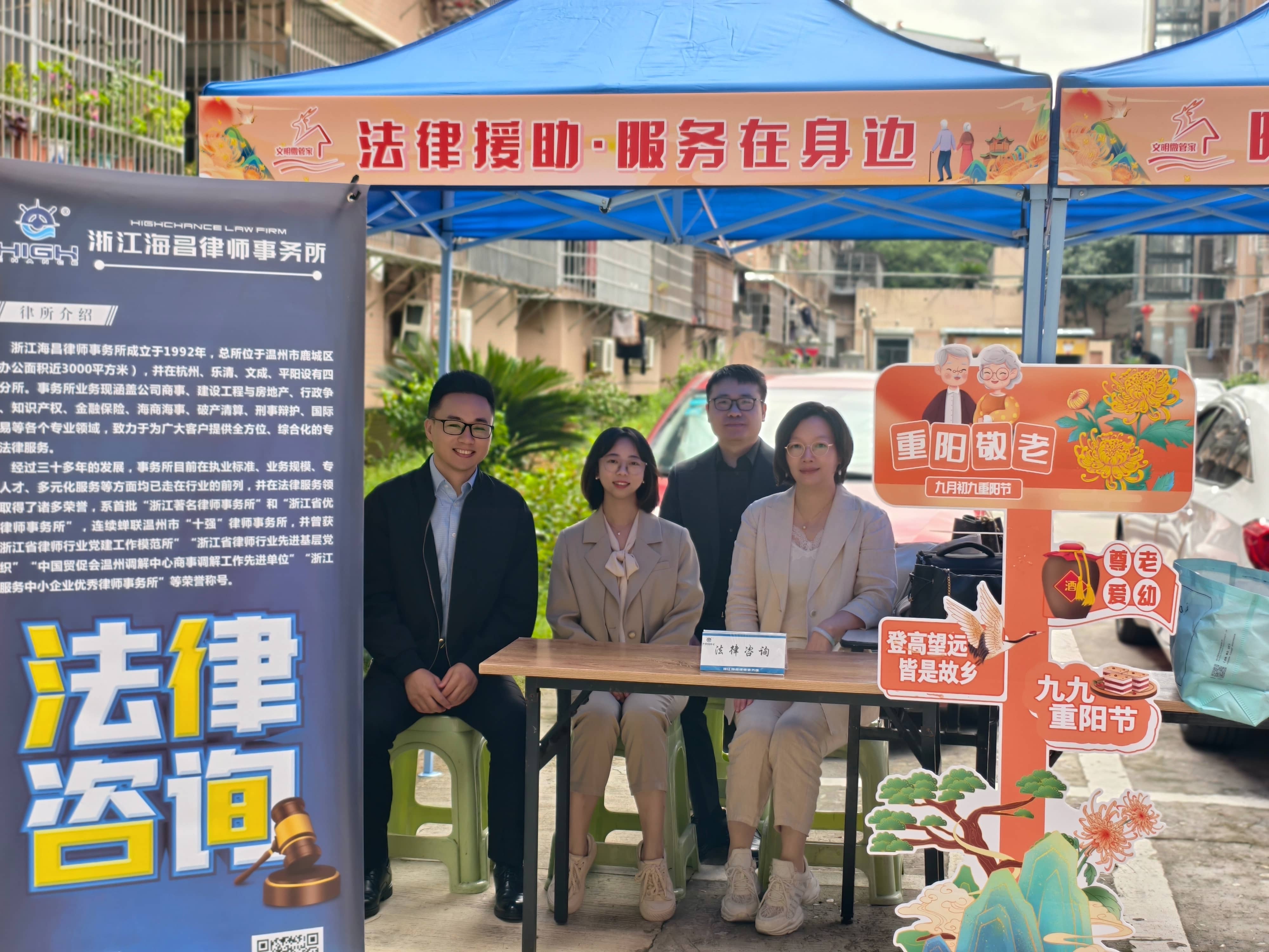 2025年10月29日,恰逢重阳敬老佳节,在蒋家桥社区电化小区举办的“爱满金秋·情暖重阳”便民市集暨“文明微管家”宣传推广活动现场,一派暖意融融。浙江海昌律师事务所陈洁、胡晓虹、朱竟业、陈楚、蔡嘉瑞五位律师,作为鹿城区首批“家庭律师”试点律所的代表,将专业的法律服务展台融入热闹的市集之中,成为活动中一道亮丽的风景线。