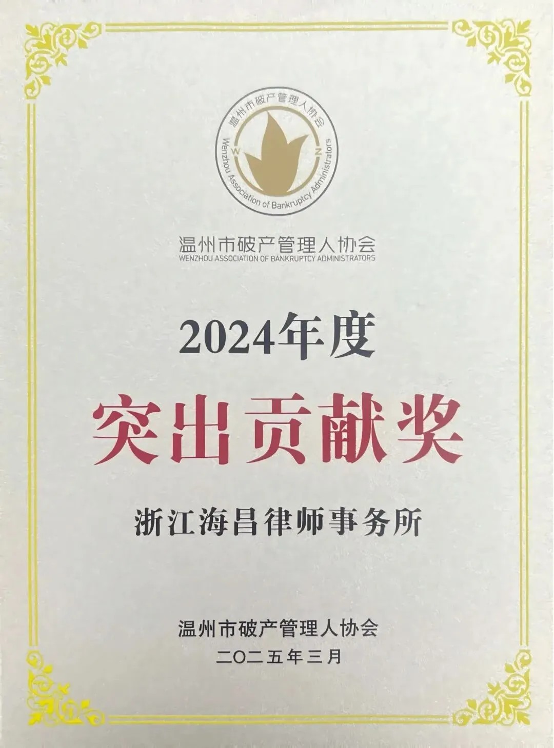 此次大会上,浙江海昌律师事务所企业破产与重整团队收获多项荣誉,被温州市中级人民法院评为“2024年度优秀管理人”,被温州市破产管理人协会评为“2024年度优秀管理人”,并荣获“2024年度突出贡献奖”。多名团队成员在评选中荣获奖项,成功获聘温州市破产管理人协会重要职务。